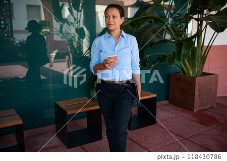 Confident professional woman walking with smartphone and folder in modern outdoor setting with greenery