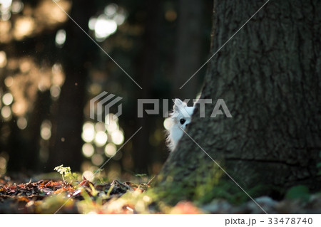 木の根元に隠れるチワワ