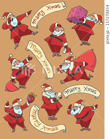 Set of Santa Claus in different poses. Advertising for the coming New Year and Christmas. Greeting cards for loved ones on the winter holiday.