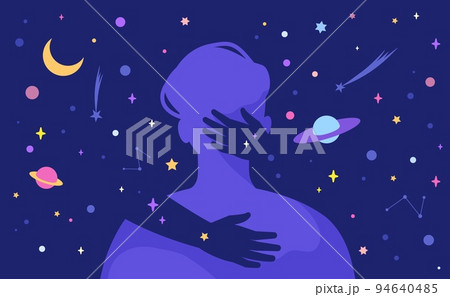 Hug universe. Woman hands hugging spiritual friend kiss dream lover mystic couple embrace occult power zen energy spirit connection abstract sexy guy silhouette vector illustration