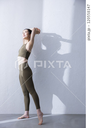 スタイルが綺麗な下着姿の若い女性 洗面台 外出準備 キャミソール スレンダー 下着姿