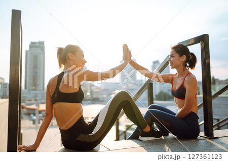 Two Young woman exercising and stretching outdoors in the morning. Sport, Active life.