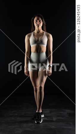 Young beautiful woman with athletic body on dark background. Fitness girl