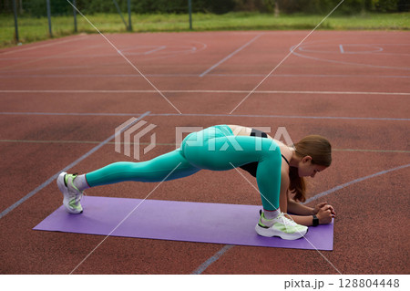 Fit woman stretching on a purple yoga mat outdoors, showcasing flexibility and strength in a vibrant athletic environment. Workout concept