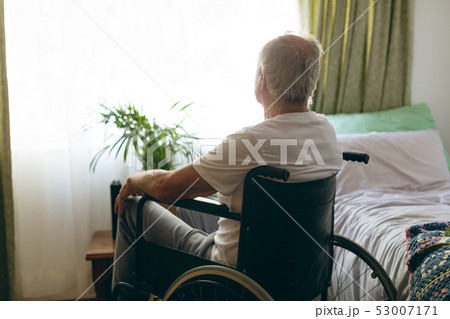 Male patient looking outside the window while sitting in wheelchair