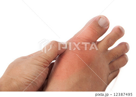A pair of feet with the right foot inflamed with gout, left foot normal