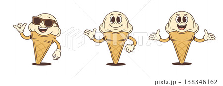 Groovy Set Of Ice Cream Cone Cartoon Character Poses Vector Illustration