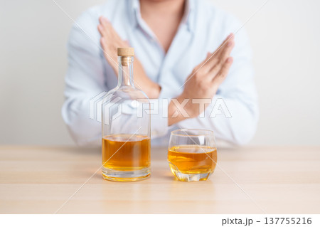 Man making stop hand gesture to refuse a glass of whiskey, Healthy man say no to alcohol drink, stop alcoholism and addiction concept. Responsible man reject a drink before driving and quit booze
