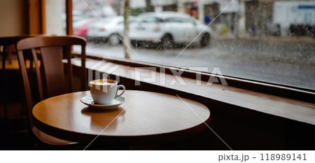 パリのとある通りに面した大きなガラス窓のあるコーヒーショップ。テーブルの上には入れ立てのカフェオーレ