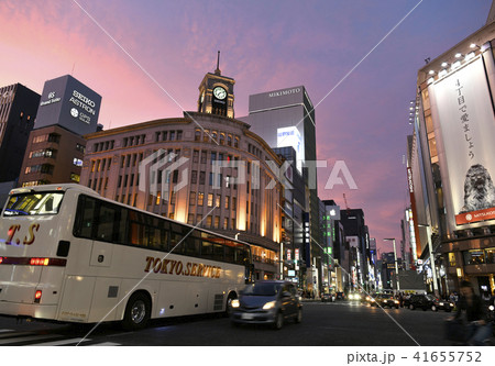 日本の東京都市景観 夕焼けに映える銀座の街並みと車の流れ