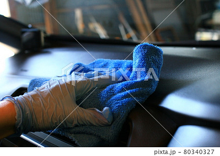 Gloved hands of young man cleaning steer with wet wipe before driving home
