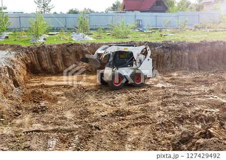 The excavator works to clear the soil and move it out of the excavation at the construction site