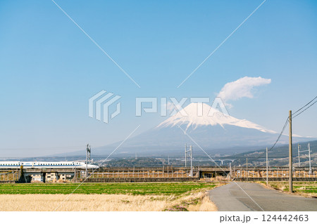 【静岡県】春の青空の下の富士山と麓を走る新幹線