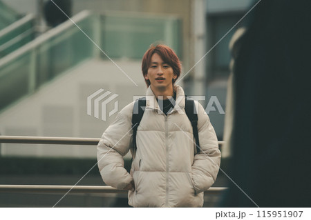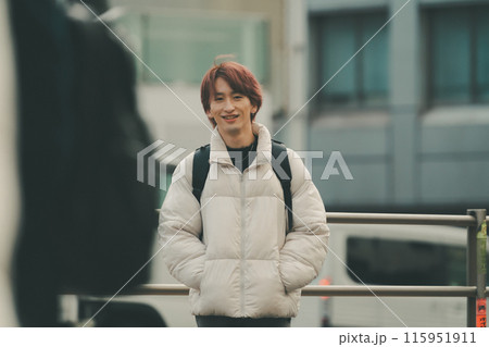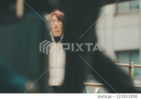 都会の街角に立つスマホを操作する若い男性