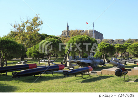 The castle grounds in Dieppe feature a grassy area with antique cannons positioned for defense in Normandy, France.
