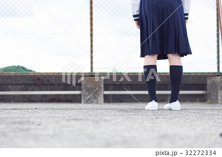 学校の校庭・グランドを歩くブレザー姿の女子生徒の足元