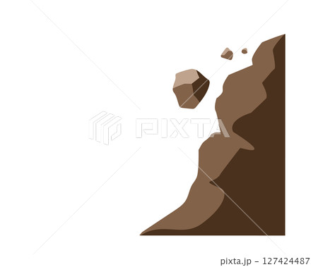 Rock rolls off cliff. Falling boulder. Rockfall and landslide. Brown earth. Flat cartoon illustration. Business concept of crisis and problems. Element of nature and mountains