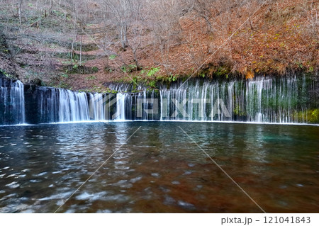 美しき信州長野(軽井沢、晩秋の白糸の滝。数百の水源より流れ落ちる水のしぶきが金色に輝いて見えた。)