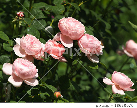 新緑の中で朝日を浴びて生き生きとし幻想的に浮かび上がった親子のピンク色の花(バラ)