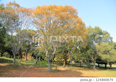 秋の公園 黄葉 ケヤキの木