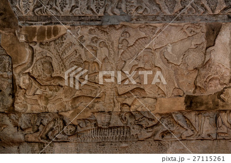 アンコール・ワット第一回廊のレリーフ(天国と地獄)の金箔(?)が残る部分