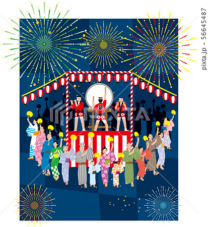 盆踊りと花火。日本の伝統行事。ベクター素材