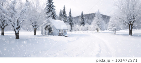 北欧の雪景色 小さな家、ソリの跡。AI生成画像
