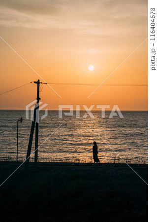 夕日に向かって歩く女性