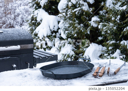 Outdoor barbecue grill and frying pan covered with snow in winter garden, cooking tools lying on snowy table. Concept of winter grilling, backyard lifestyle and cold season cooking.