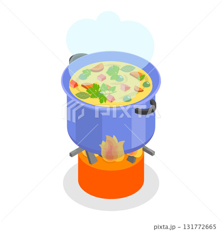 3D Isometric Flat Vector Set of Field Kitchen Elements, Cooking Food On Camp Stoves. Item 3