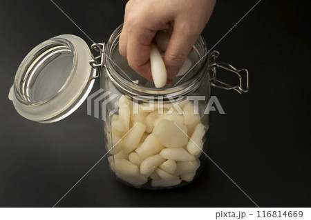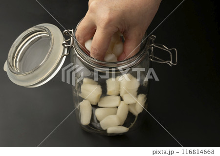 らっきょうを漬ける 瓶に漬けたらっきょう