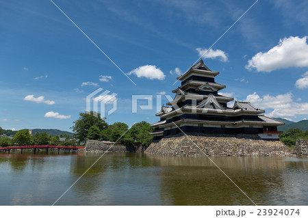 松本城(夏 晴天 城 青空 写込み 堀 赤い橋 石垣)