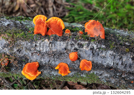 秋に発生した鮮やかなオレンジ色のヒイロタケ