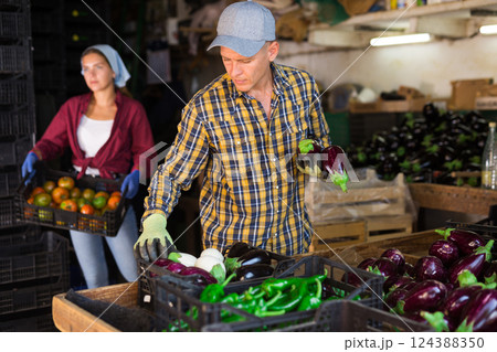 Hardworking man sorts ripe recently harvested eggplants in a warehouse