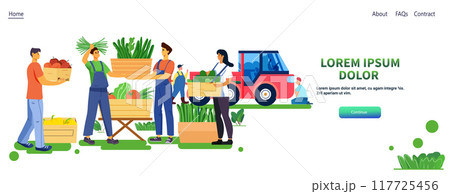 Farmers market with fresh produce vegetables and fruits people carrying baskets red tractor in background website design template