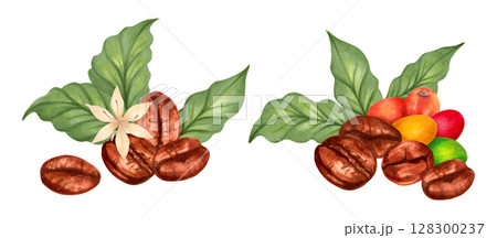Coffee beans with coffee tree berries and flower. Watercolor botanical illustration. Hand drawn isolated art. Composition for packaging, cookbook, menu. Aroma of robusta and arabica varieties.