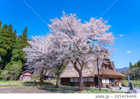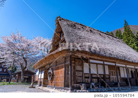 富山県五箇山 桜咲く春の菅沼合掌造り集落の中の五箇山民俗館