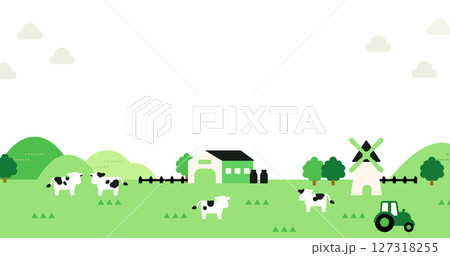 牛と風車の牧場背景・酪農イメージ・シンプルな田園風景イラスト