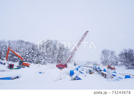冬の水路工事現場のクレーン車