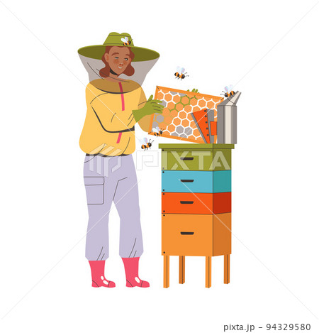 Equipped Woman Beekeeper or Apiarist with Honeycomb Gathering Sweet Honey from Beehive Vector Illustration