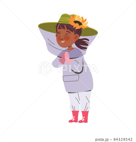 Equipped Little Girl Beekeeper or Apiarist Standing in Protective Hat and Smiling Vector Illustration