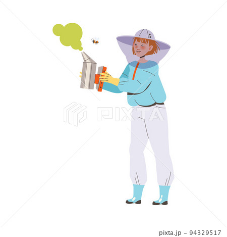 Equipped Woman Beekeeper or Apiarist with Smoker Gathering Sweet Honey from Beehive Vector Illustration
