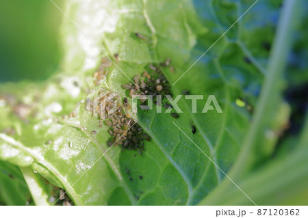 野菜に群がる虫(アブラムシ ハクサイの葉)