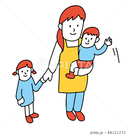 保育園でお見送り・お迎えの親に手を振る子供のイラスト