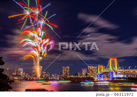 Odaiba, Tokyo, Beautiful and colorful firework with rainbow bridge and Tokyo city night view, event every summer and winter. Fireworks presented in layers red yellow orange and purple glowing light.