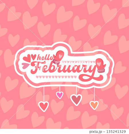 Hello February square banner with text and pink love valentines hearts and pink mittens isolated on pink abstract background. Hello February lovely sticker, label , banner, poster design template