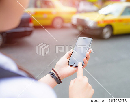 スマホでタクシーを呼ぶビジネスマン ビジネスバッグ