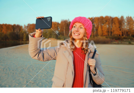 Autumn portrait of stylish happy smiling young woman with phone, beautiful girl holding smartphone