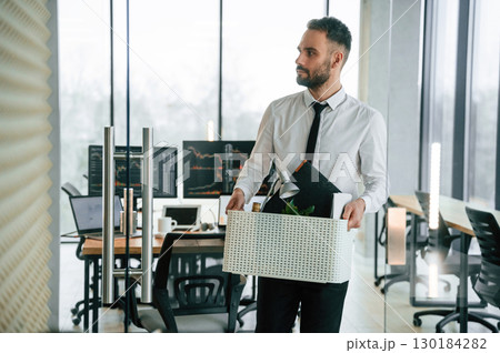 Unfinished project, holding digital tablet. Industrial worker in wooden warehouse