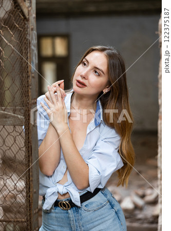 Young woman in tied shirt posing near wire fencing in abandoned house